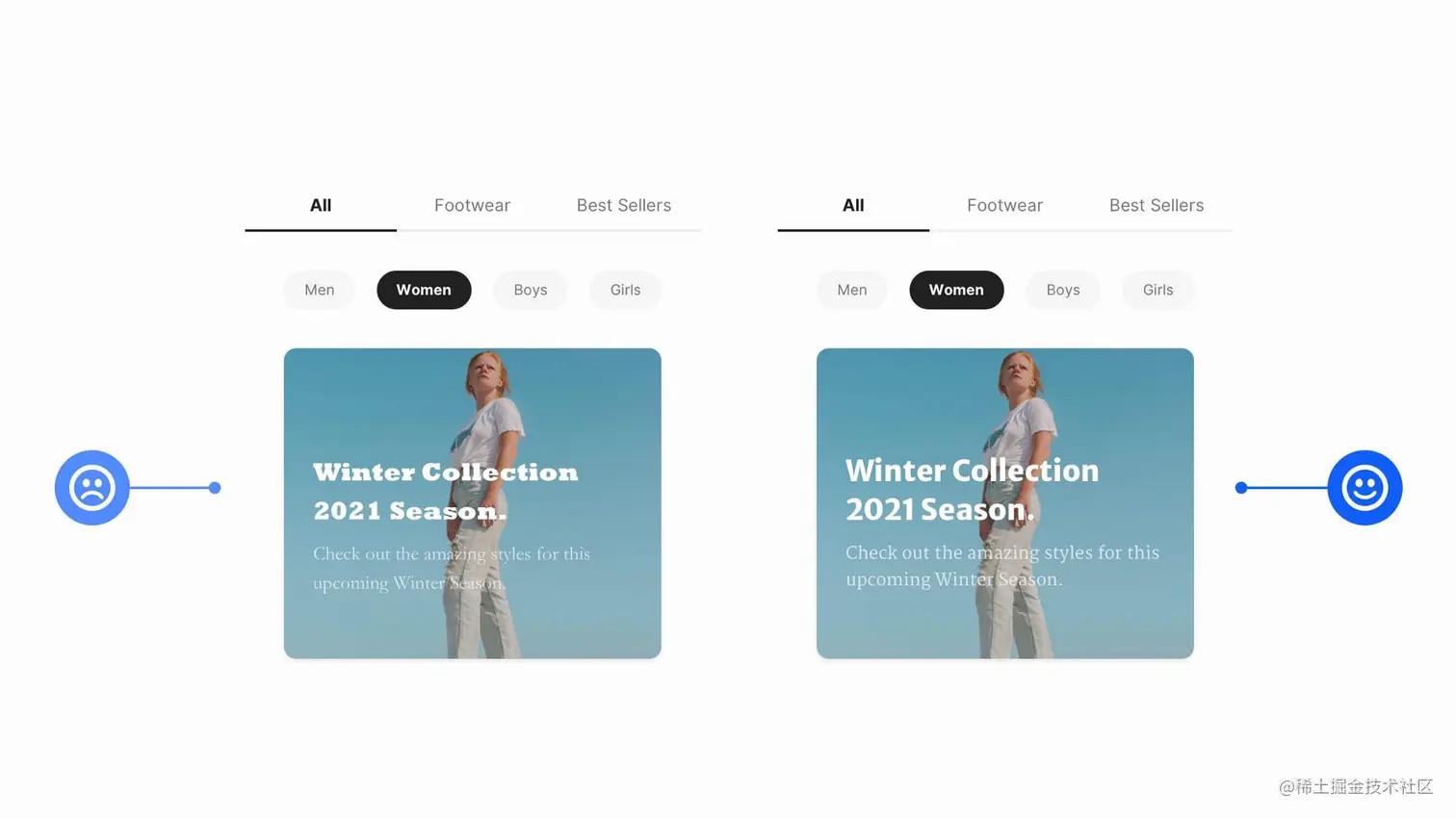根据文本在图像上的位置,你可以使用覆盖整个界面的颜色叠加图层,也可以使用更细微的(从下到上,或从上到下)渐变叠加图层,来使两个元素之间的对比更加强烈。
