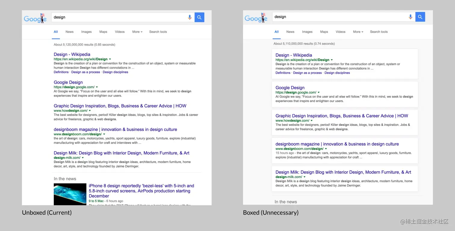 Google搜索加框和不加框的效果对比图。