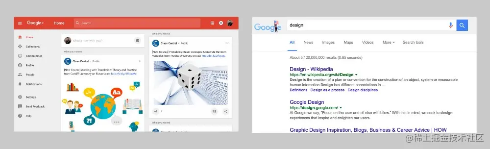 把Google搜索和Google+的页面放在一起比较来看,明显Google搜索的风格看起来更加赏心悦目,不是吗?