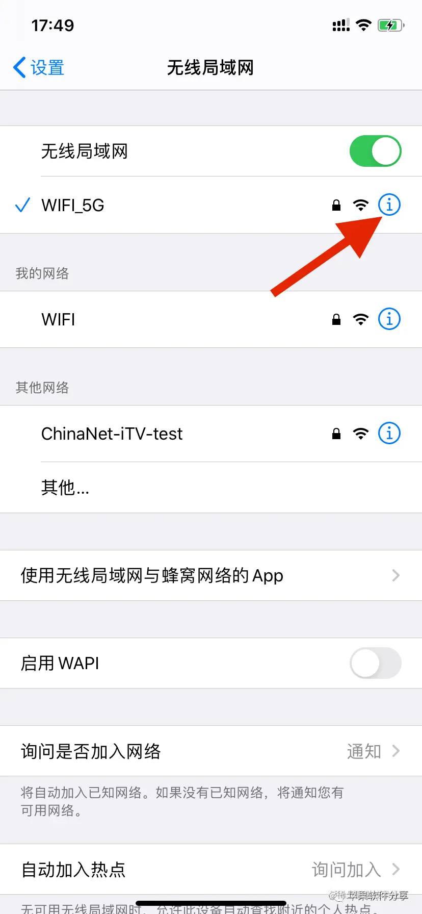 进入手机的「设置」-「无线局域网」页面,点击已经连接 Wi-Fi 的4a0f1457aae28221637cf5554d9fb27c.png图标。