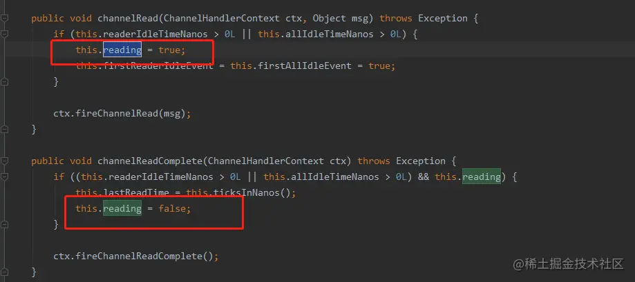 可以看到run方法内 我们先判断是否这个pipeline还存在数据读取,只有不存在数据读取的时候,才会进行执行代码。this.reading参数在channelRead和channelReadComplete内修改的: