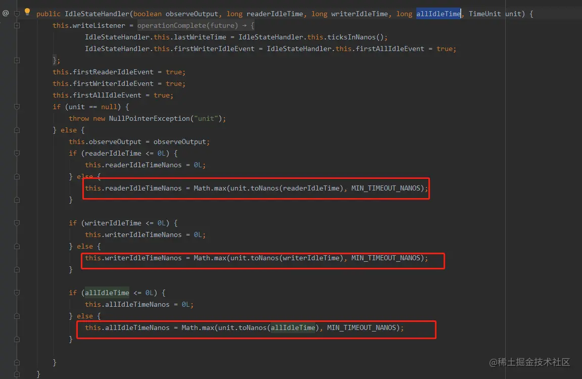 利用IdleStateHandler 的构造函数进行超时时间的设置。