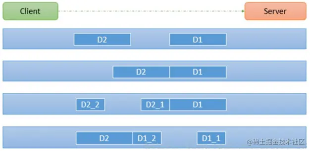 TCP是一个流协议,就是没有界限的一长串二进制数据。TCP作为传输层协议并不不了解上层业务数据的具体含义,它会根据TCP缓冲区的实际情况进行数据包的划分,所以在业务上认为是一个完整的包,可能会被TCP拆分成多个包进行发送,也有可能把多个小的包封装成一个大的数据包发送,这就是所谓的TCP粘包和拆包问题。面向流的通信是无消息保护边界的。 如下图所示,client发了两个数据包D1和D2,但是server端可能会收到如下几种情况的数据。