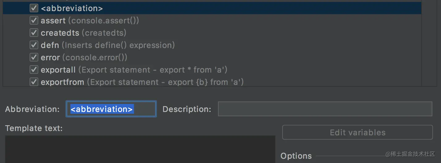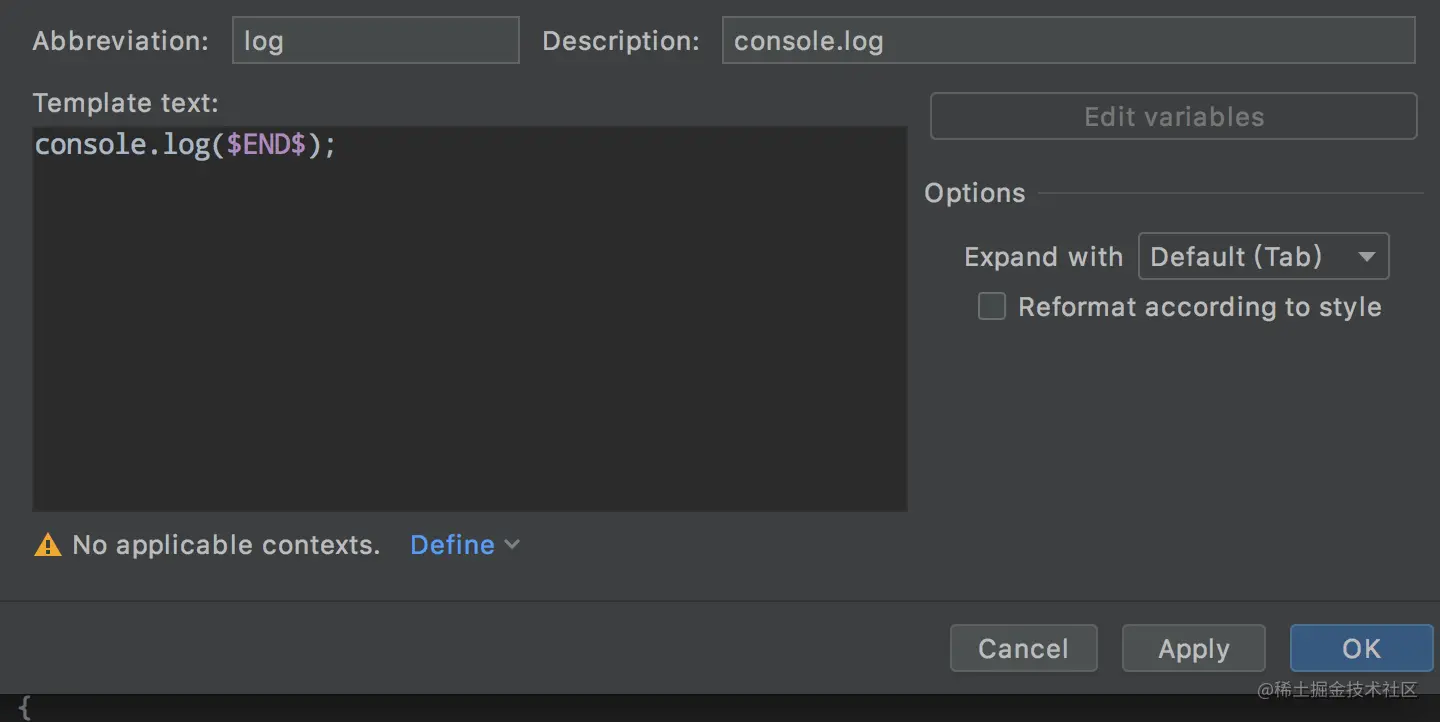 在Abbreviation中输入触发代码块的指定,Description中输入指令描述,以简单的console.log()为例: