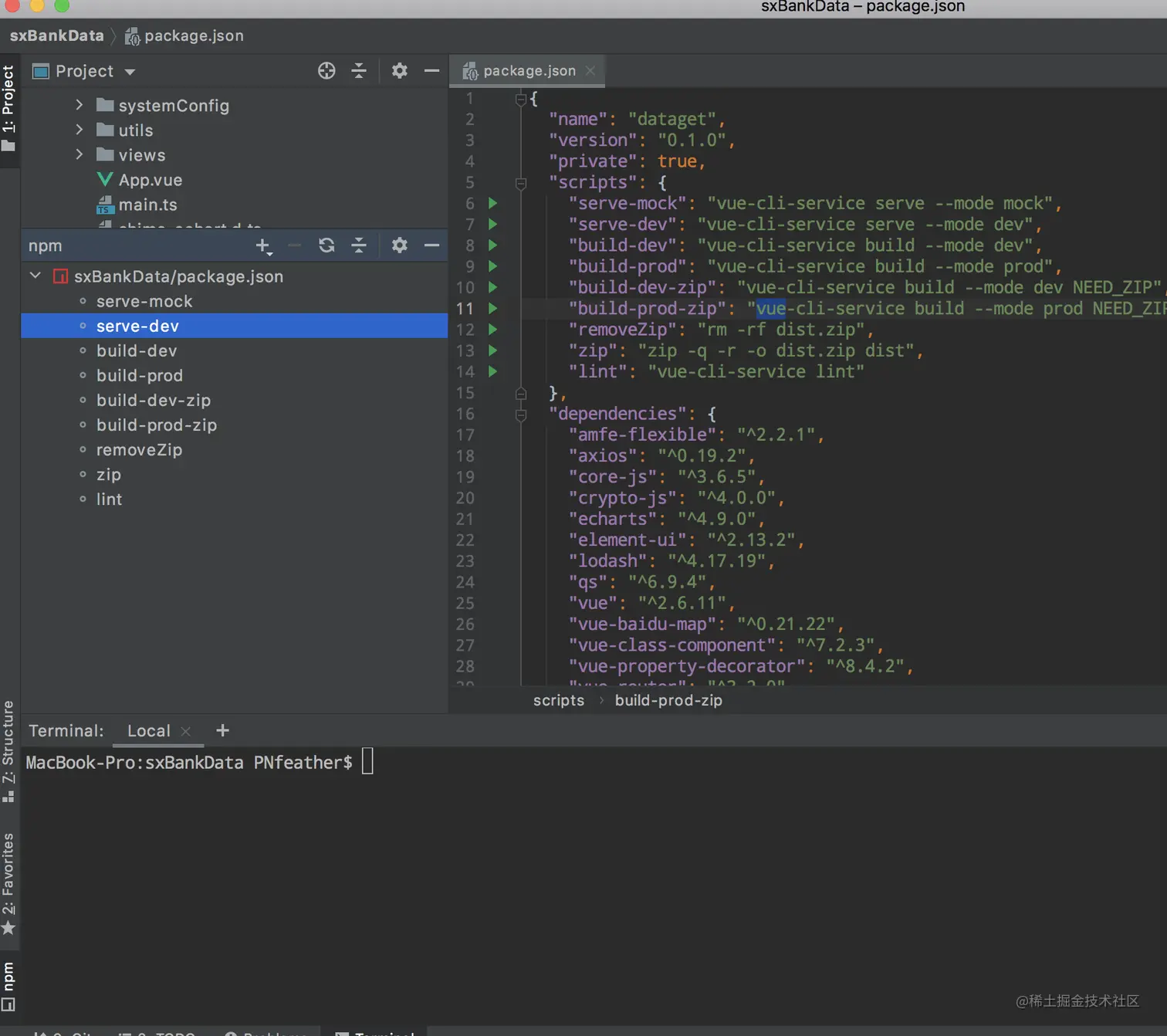 编辑器可以让我们在编辑器的npm模块中直接运行package中保存的脚本,从这里运行相比自行输入指令运行来说,可以更方便的重启停止脚本。同时我们可以考虑添加自动打包压缩指令,甚至代码提交指令等。