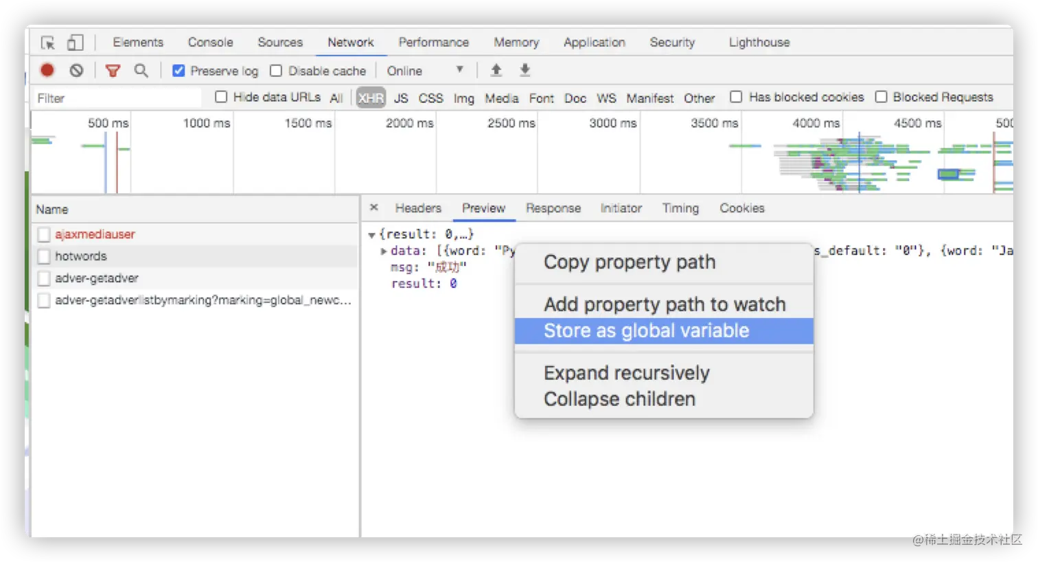 浏览器打开Network,选择你要获取数据的接口,右键点击'Store as global variable'