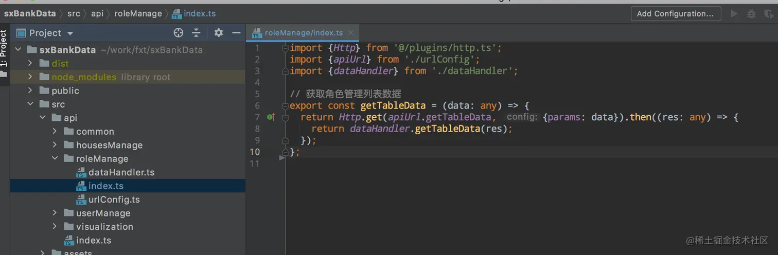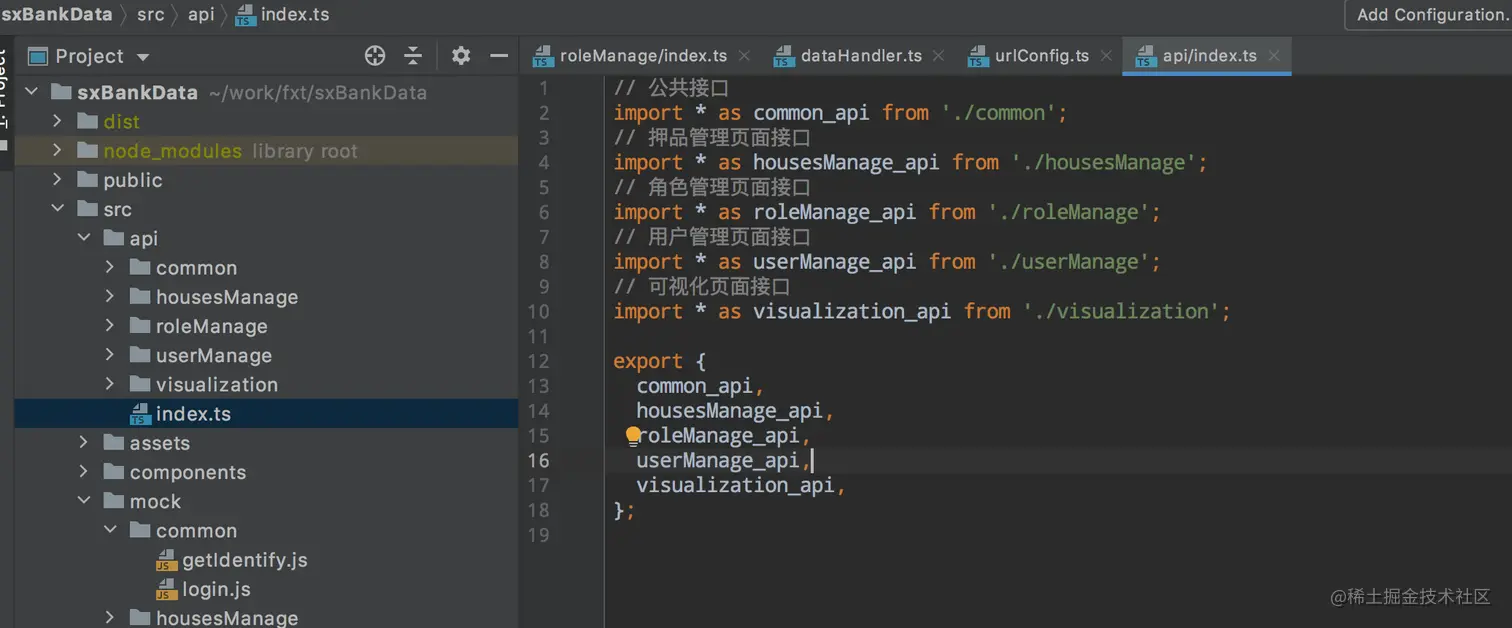 api建议做一个统一的抛出,这样引入的时候就会非常方便,当然我这里目录文件与抛出的api变量名没有对应起来,没有做到位,应该要调整,这样找接口的时候可以直接定位对应的文件夹。