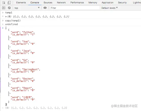 切换到Console,可以看到生成了一个temp1变量(数字会根据你复制次数递增),控制台输入copy(temp1)后就已经把需要的数据添加到了剪切板,使用粘贴功能即可复制需要的数据。