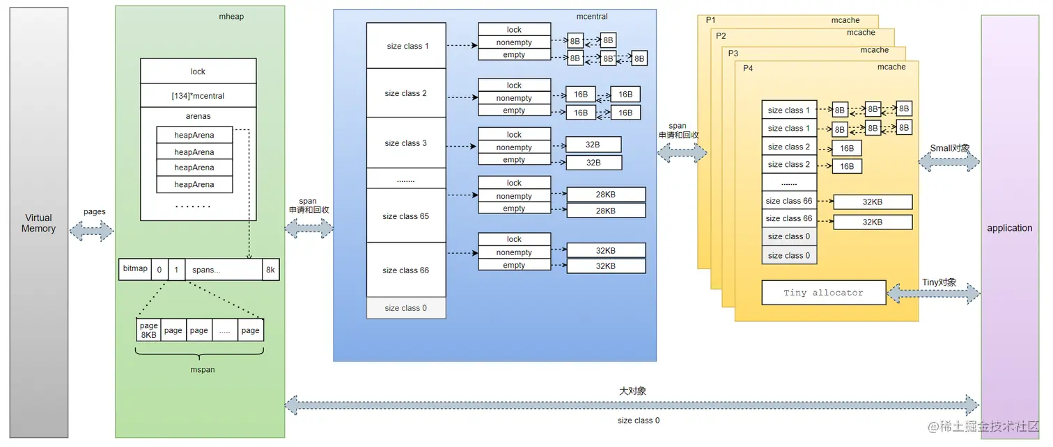 小对象是在mache申请适合自己大小的span,若mache没有可用的span,mache会向mcentral申请,加锁,找一个可用的span,从nonempty删除该span,然后放到empty链表中,将span返回给工作线程,解锁;若没有足够的内存,mcentral还会继续向mheap继续申请。