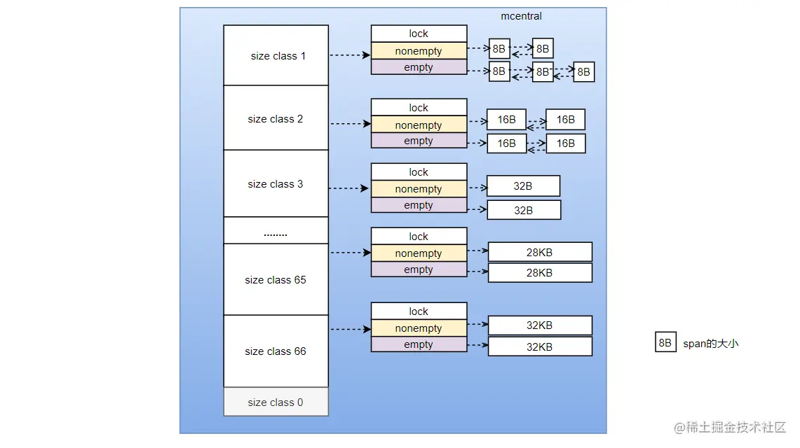 mcentral存储67级别大小span,其中size=0是不使用的(图中标灰色)。每一级别的span分为2种,一种empty表示这条链的mspan已经被分配了对象,或者已经被mcache使用,被对应线程占用;nonempty表示有空闲对象的 mspan列表