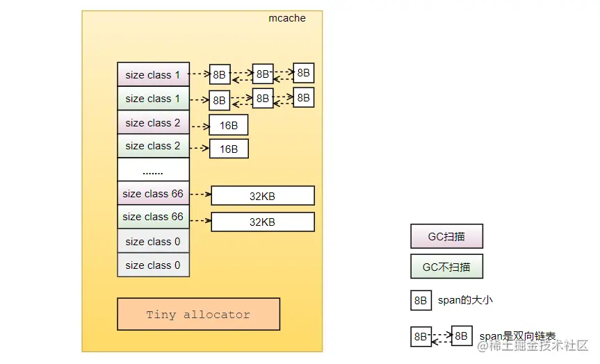 小对象是选择最适应自己大小的span进行分配,从图中可以可以看到同一级别的span是分成2类的,一类是可以被GC扫描的span,里面是包含指针的对象;另一类似不可以被GC扫描的span,里面不包含指针的对象。可以看到分配内存的时候会按照是否有指针对象对应不同的span,为了后续GC垃圾回收使用。
