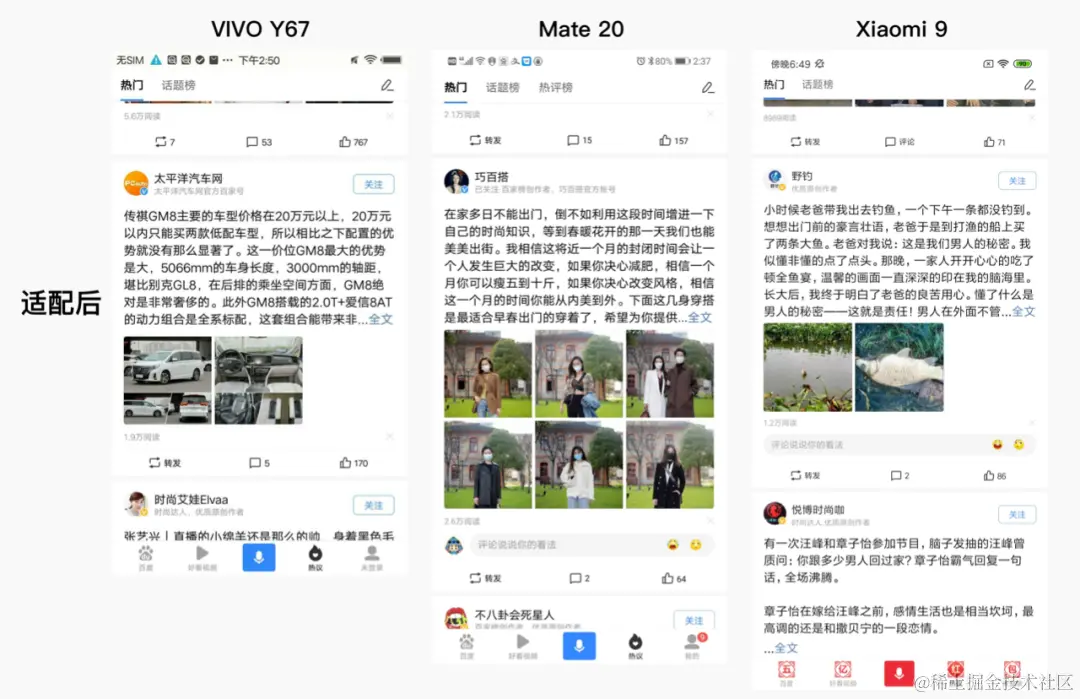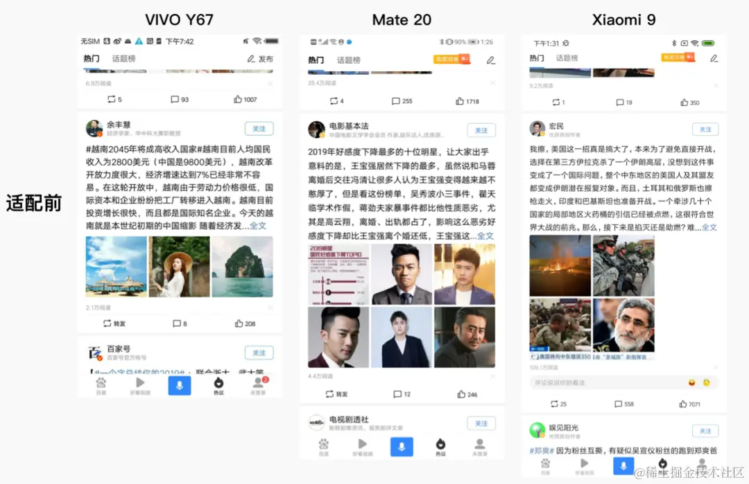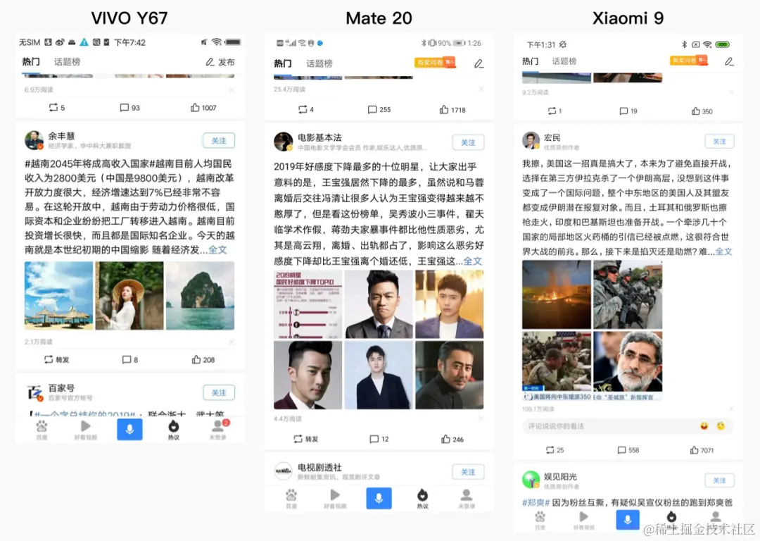 该图为热议页面的图文模板在三款设备上的显示效果。可以看到TextView的行间距在三款设备下的一致性表现不尽如人意,而这已成为日常UI开发以及视觉review过程中的一大痛点,降低了大家的工作效率。