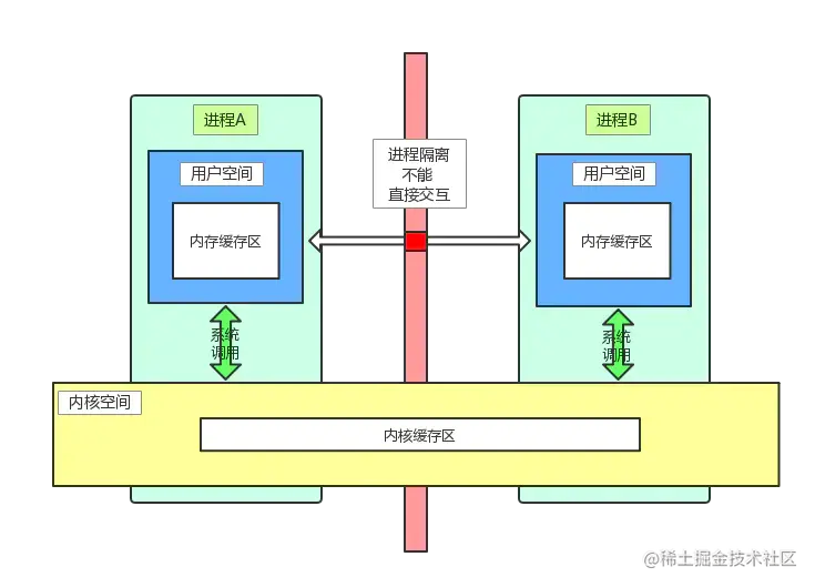 由于 Linux 采用了虚拟地址空间技术,操作系统在逻辑上将虚拟内存分为用户空间(User Space)和内核空间(Kernel Space)普通应用程序运行在用户空间,系统内核运行在内核空间,为了控制应用程序的访问范围、保证系统安全,用户空间只能通过系统调用的方式去访问内核空间。当进程执行系统调用而陷入内核代码的时候,该进程则进入了内核态,相比之下,进程在用户空间执行自己的代码的时候,则是处于用户态