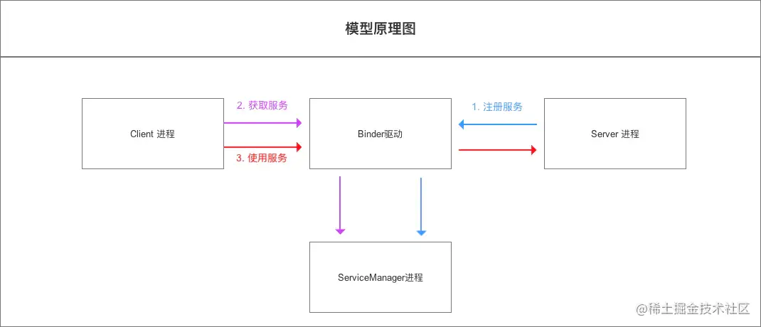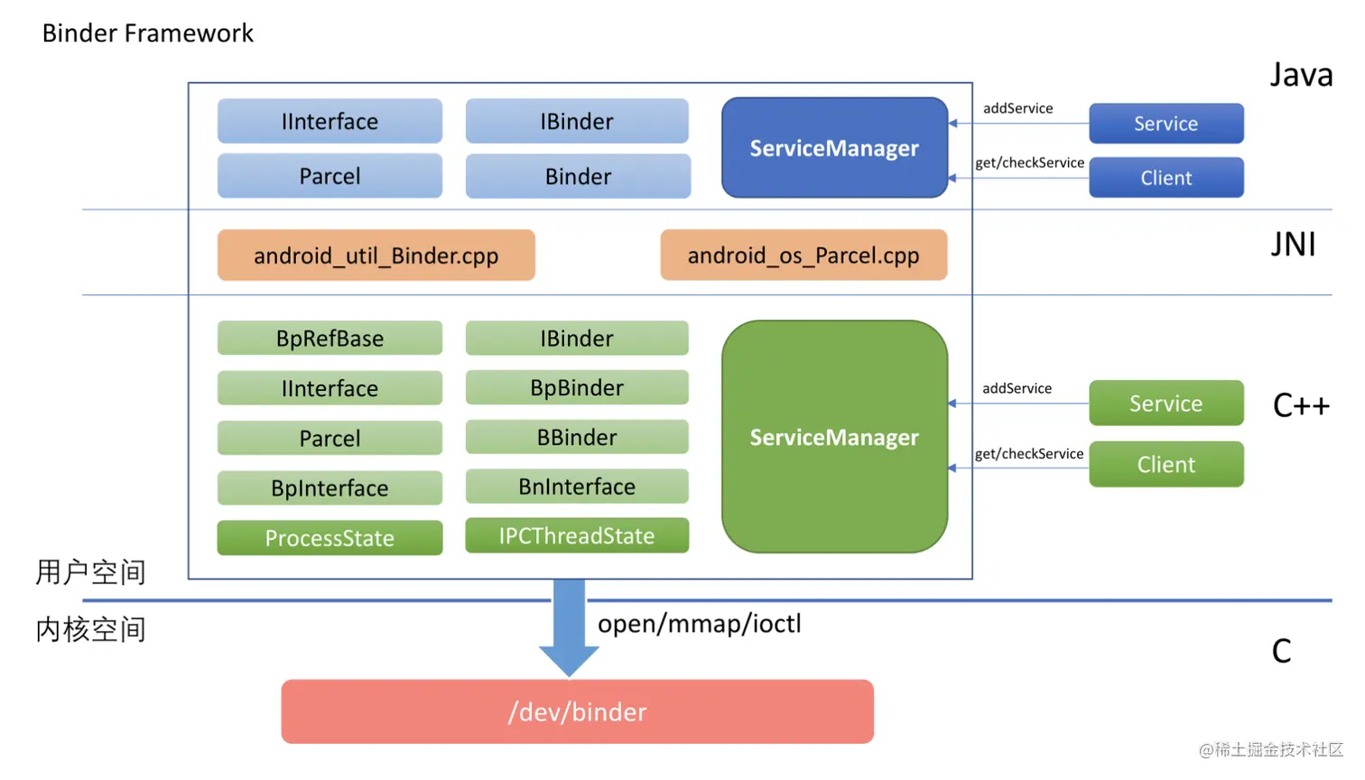 其中,Client、Server 和 ServiceManager 运行在用户空间,Binder Driver 运行在内核空间,Client 和 Server 需由用户自己实现,ServiceManager 和 Binder Driver 则由系统提供。Binder IPC 通信过程通常: