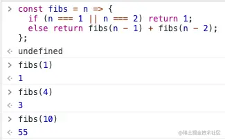 先写递归出口,当 n === 1 或 2 时(即前两项),返回 1,否则将前两项的结果相加返回。