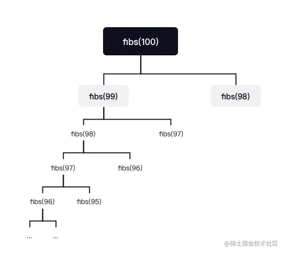 做的处理很简单,引入了一个 dict(或者 map) 来保存中间状态的计算结果,牺牲空间换时间。在进行递归操作之前,如果计算结果已经被 dict 缓存了,就直接从缓存中取,否则的话才会执行递归调用过程。简单画一下当 n === 100 时,程序的递归调用过程: