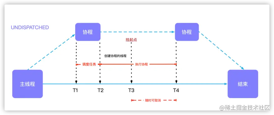 CoroutineContext。暂时可以理解成一个队列,协程任务被添加到这个队列。不代表执行了。 - 调度到执行之间是有时间的