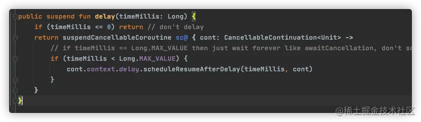 什么叫做挂起点呢,就是执行挂起函数的地方,也就是执行suspend修饰过的方法函数。在示例中 delay 就是一个挂起函数
