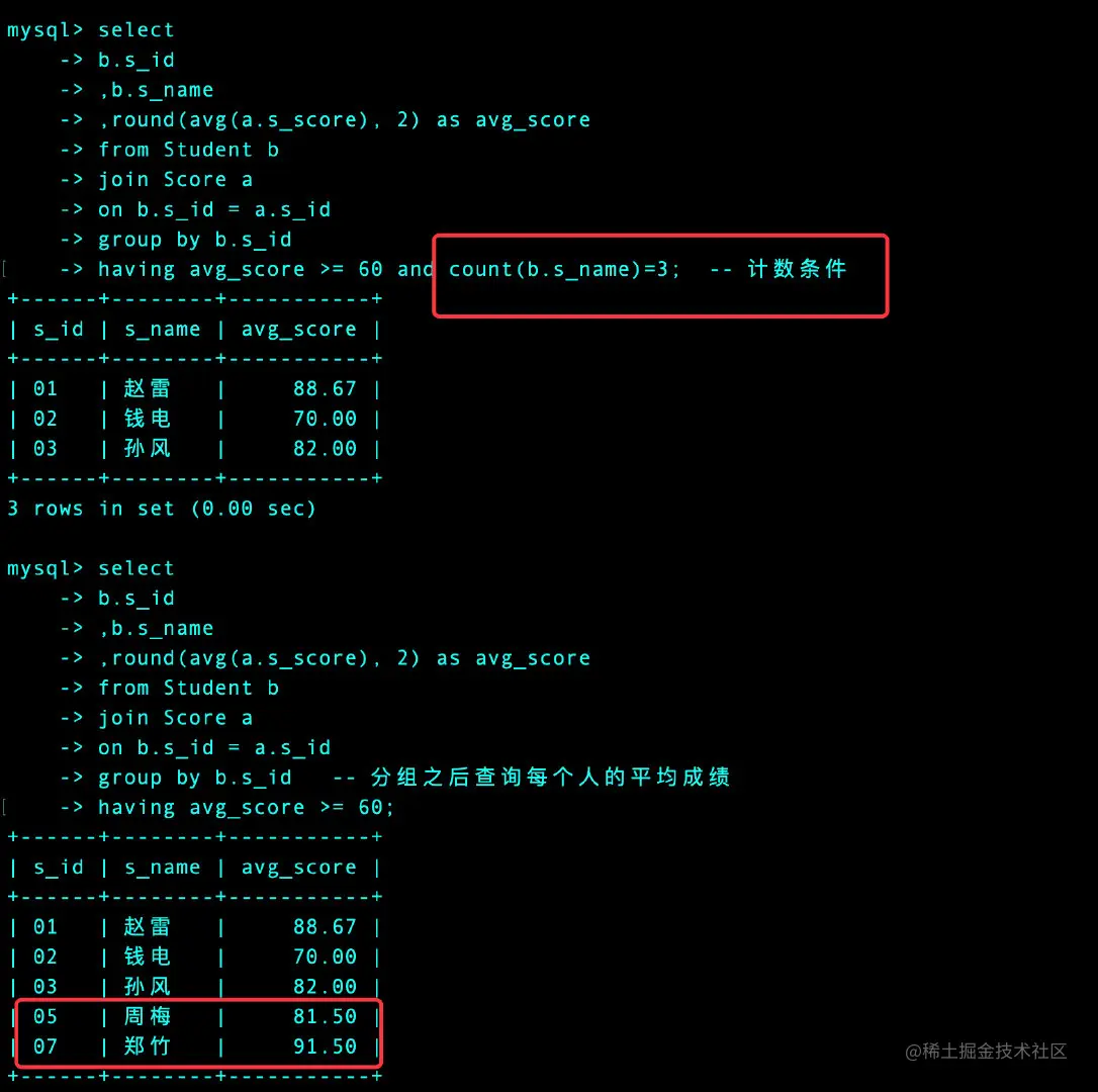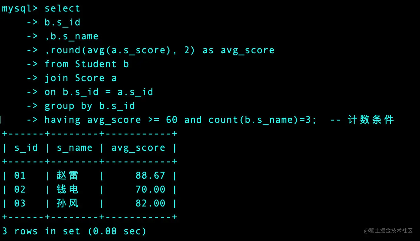 having avg_score >= 60 and count(b.s_name)=3; -- 计数条件