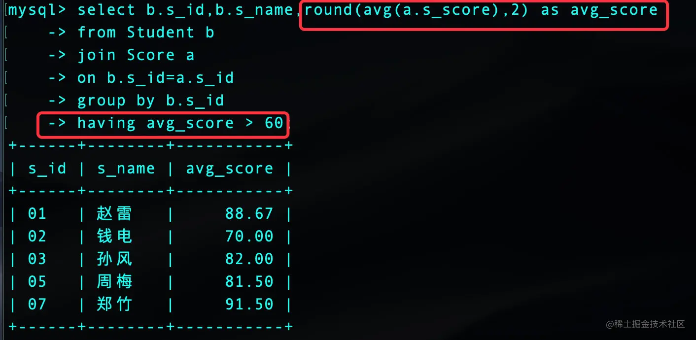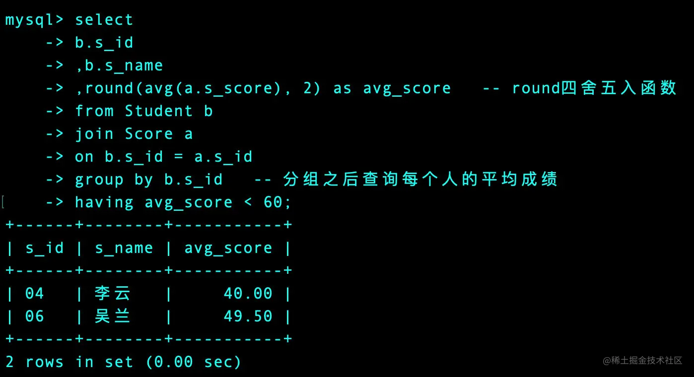 ,round(avg(a.s_score), 2) as avg_score -- round四舍五入函数