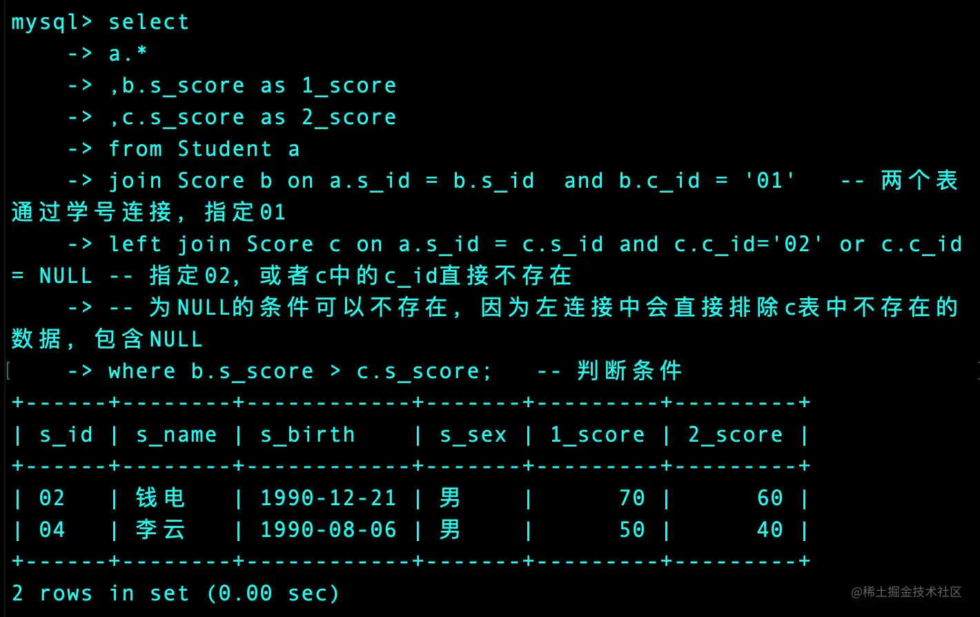 left join Score b on a.s_id=b.s_id and b.c_id='01' or b.c_id=NULL -- 包含NULL的数据