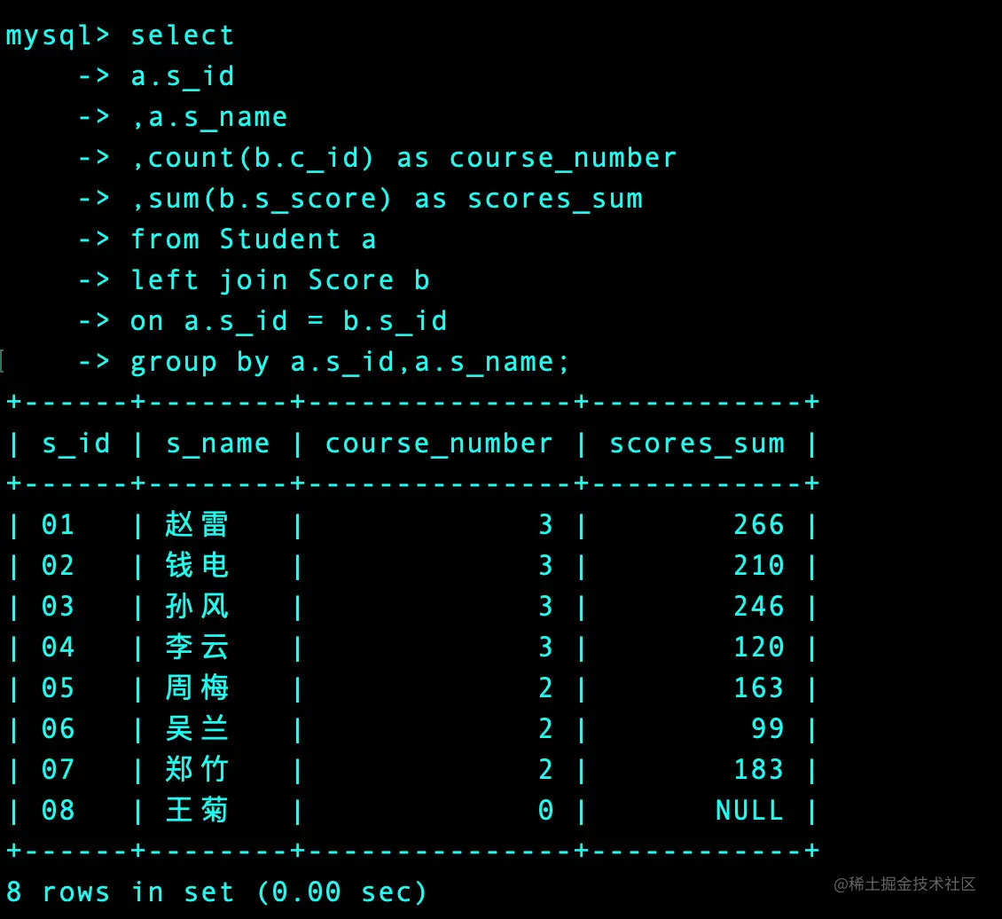 ,sum(b.s_score) as scores_sum -- 成绩总和