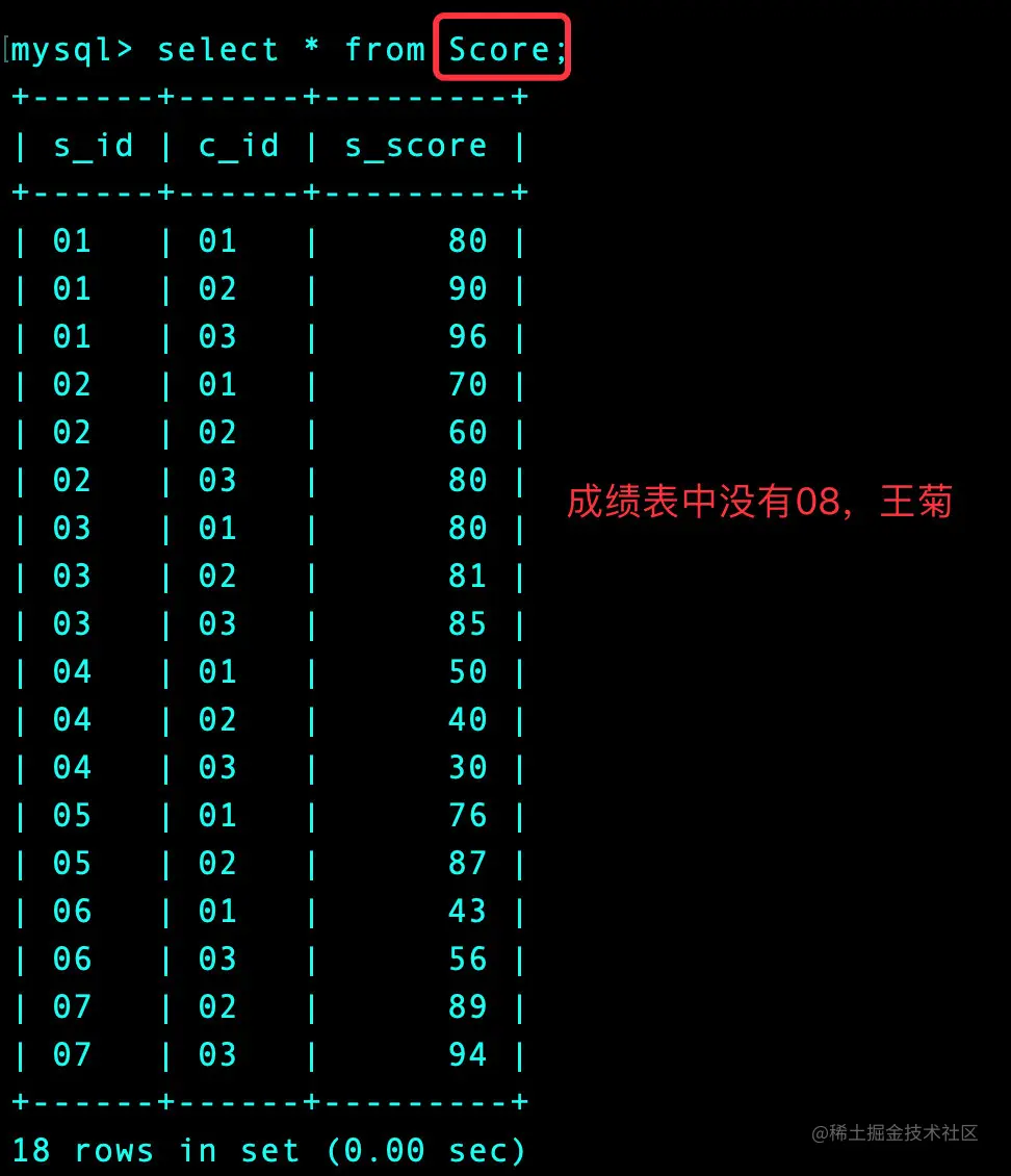 没有成绩的同学:学生的成绩(s_score)、学号(s_id)不在已知的学号中,在这里就是王菊同学