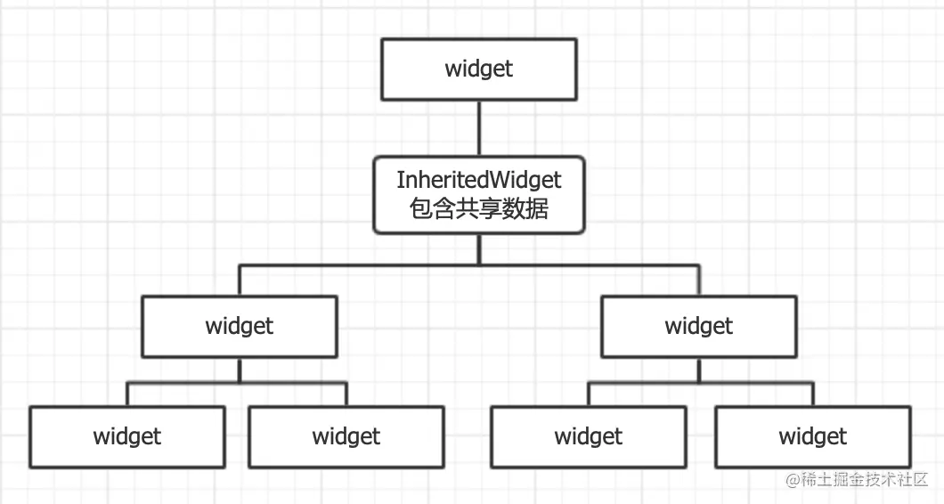 图中,InheritedWidget包含了需要共享的数据,在InheritedWidget下面的所有子孙widget都可以使用其中的数据。
