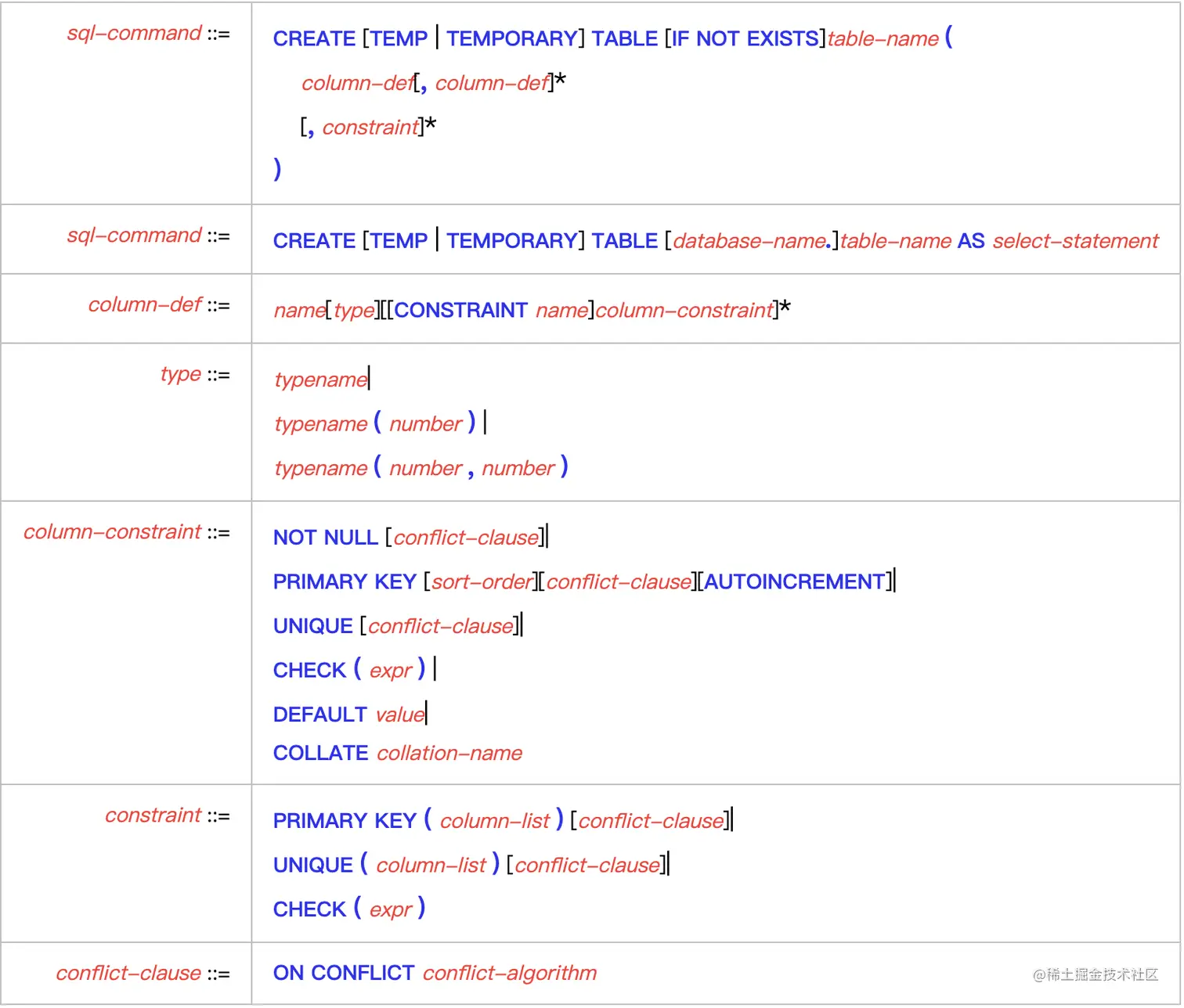 看到这句SQL是不是会发现很熟悉,那么SQL语句有什么特点呢?可以先简单看一下下图中SQLite中是如何规定创建表的语法