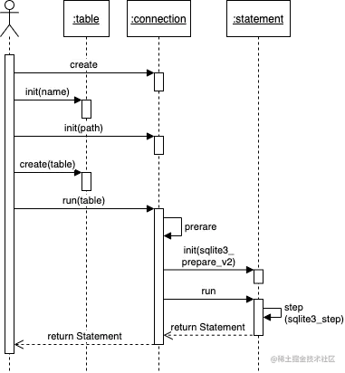 Connection的run方法执行SQL语句; Connection内部则会创建Statement对象,并调用run方法真正执行SQL语句;Statement在初始化时,会调用SQLite的sqlite3_prepare_v2函数准备执行SQL,在run方法内部则会调用sqlite3_step函数执行SQL语句;- 最后则会返回给调用者