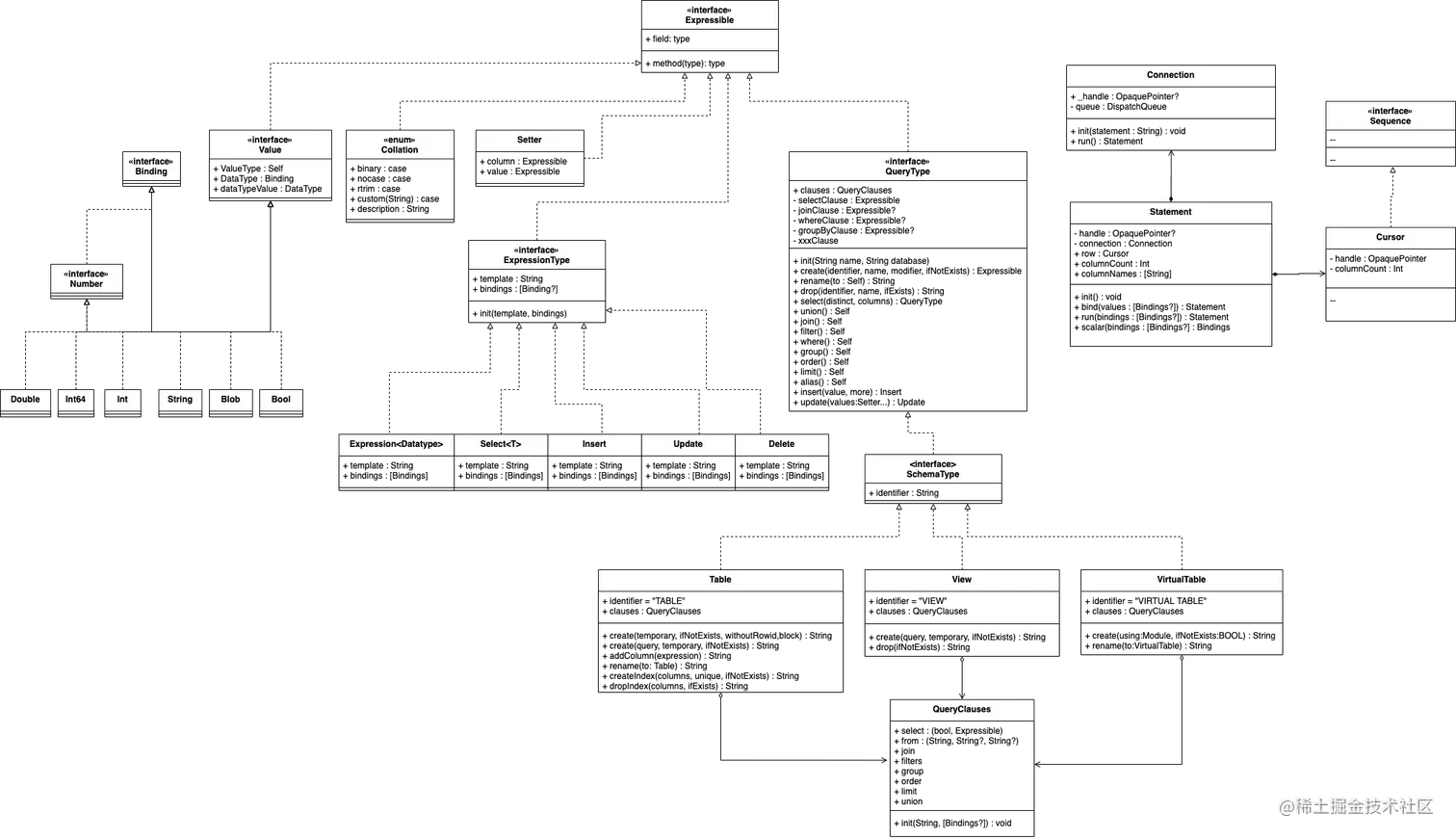 Expressible这个单词是一个形容词,意思为可表达的。在SQLite.swift中的大部分类(结构体)直接或间接实现了该协议,其含义则表示这些结构体或类,都是一个可表达的实体,可以作为SQL语句中的一部分。其中主要包括了几个部分: