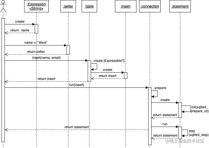 Table的insert方法,得到一个Insert对象,该对象实际表达的就是将Alice插入到name列的SQL语句; - 调用