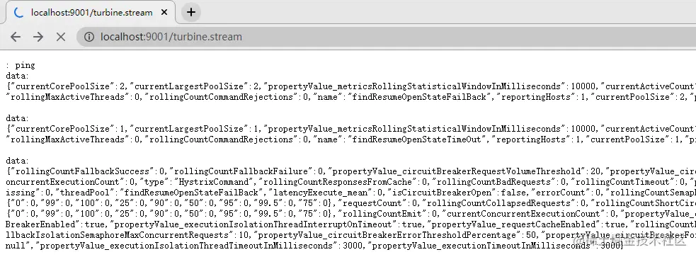 (4)访问聚合项目URL地址http://localhost:9001/turbine.stream,可以看到有数据了