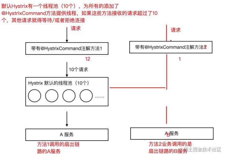 如果不进⾏任何设置,所有熔断⽅法使⽤⼀个Hystrix线程池(10个线程),那么这样的话会导致问题,这个问题并不是扇出链路微服务不可⽤导致的,⽽是我们的线程机制导致的,如果⽅法A的请求把10个线程都⽤了,⽅法2请求处理的时候压根都没法去访问B,因为没有线程可⽤,并不是B服务不可⽤。