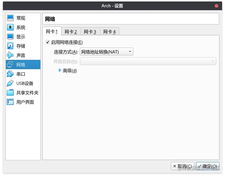网络模式中,选择 NAT 模式。这样,虚拟电脑可以使用真机网络。