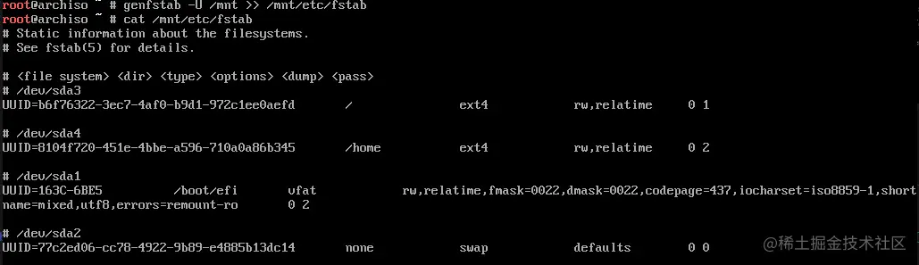 cat /mnt/etc/fstab # 查看刚刚生成的文件