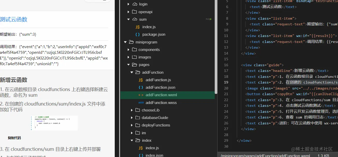 - 在创建的 cloudfunctions/sum/index.js 文件中添加如下代码