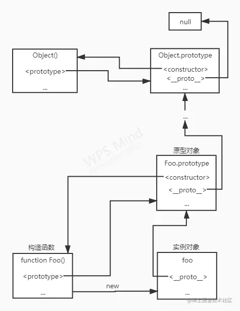在 JavaScript 中每当定义一个函数数据类型时,都会天生自带一个 prototype 属性,指向函数的原型对象。当函数经过 new 调用时,这个函数就成为了构造函数,返回一个全新的实例对象。这个实例对象有一个 __proto__ 属性指向构造函数的原型对象。