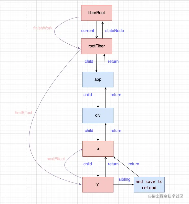 在它上面保存了包括这个节点的属性、类型、dom等,Fiber通过child、sibling、return(指向父节点)来形成Fiber树,