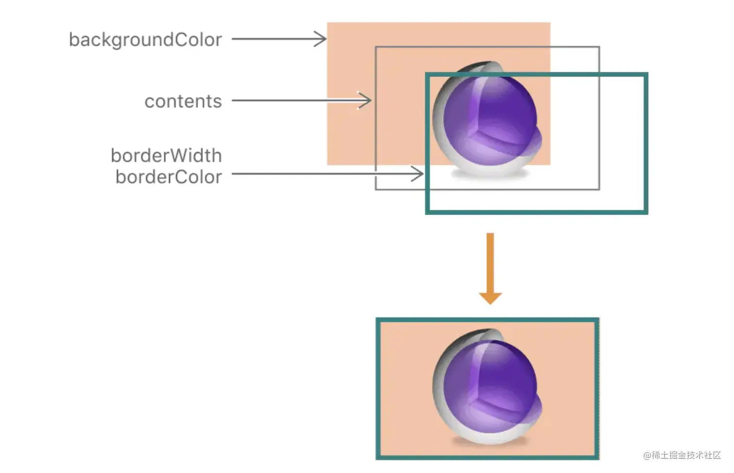 图层渲染时候,backgroundColor最底下,contents内容居中(一般该对象是一个CGImageRef对象,可通过contentsGravity属性设置图片展示模式,是平铺整个bounds还是等比例展示),border在最上面,如果该layer有子layer,则子layer也显示在boarder下面。