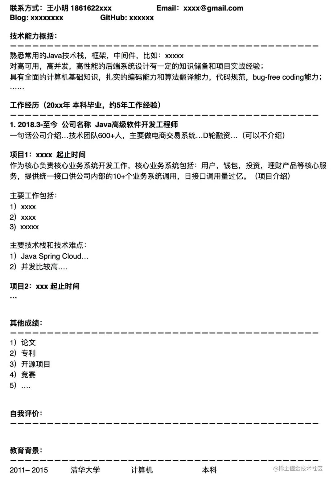 尽管对于应聘研发岗来说,简历不需要做的很花哨,更不需要封面和照片,但起码要做到结构清晰。最好写得跟“八股文”一样,能让面试官一眼就能看清简历主要包含哪些部分,每个部分的起止在哪里。