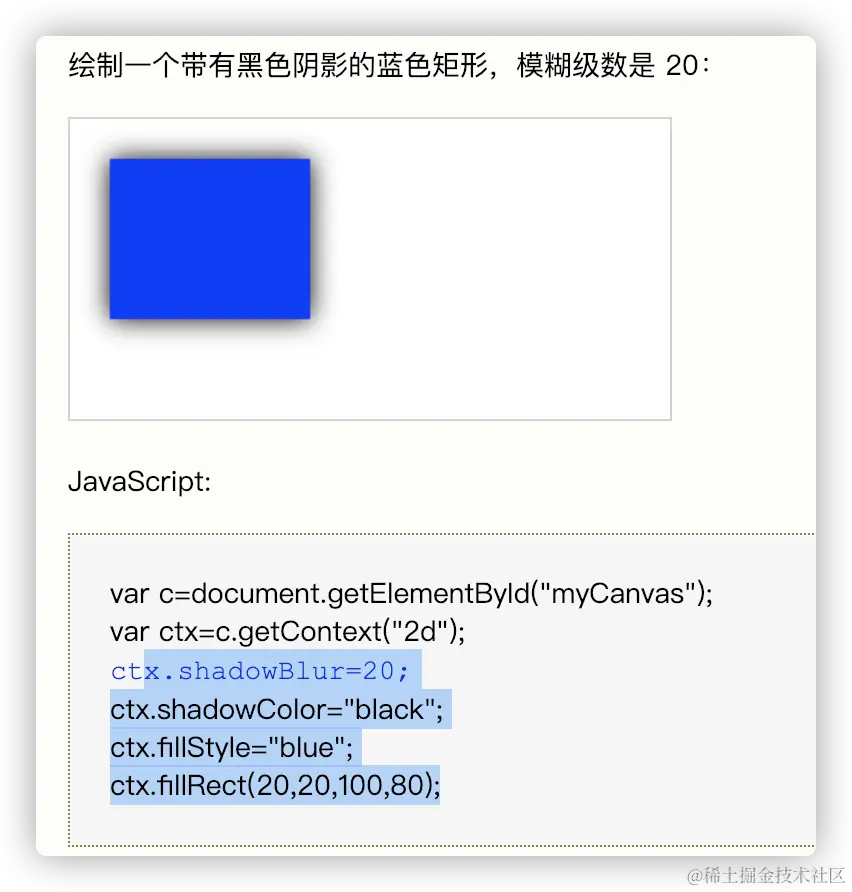 绘制一个带有黑色阴影的蓝色矩形,模糊级数是 20: