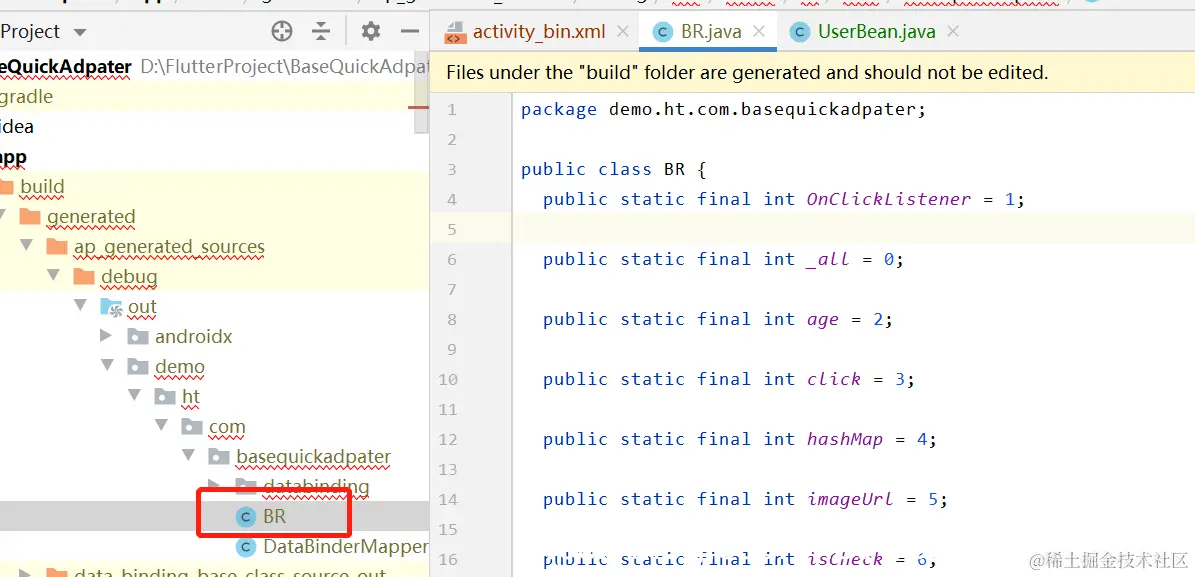 DataBinding会自动生成自己的BR控件类,需要获取BR中的对应方法.