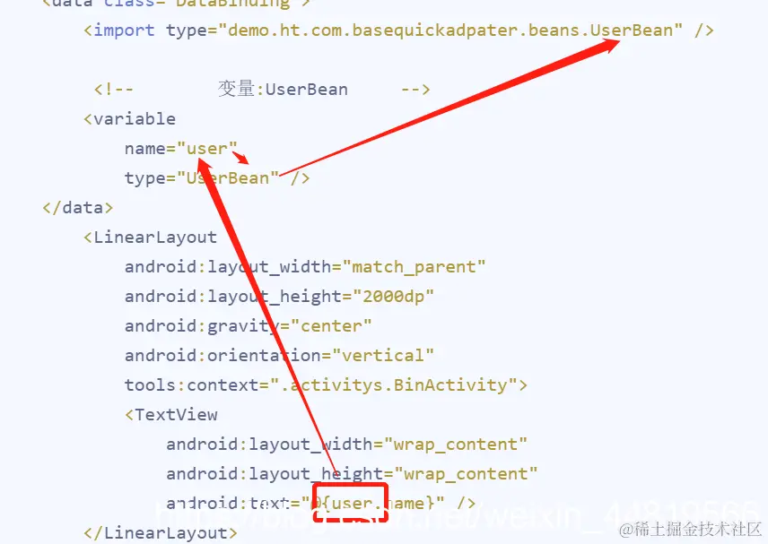 - <variable name = “别名” type=“包名”> 用来定义变量,提供下面布局使用