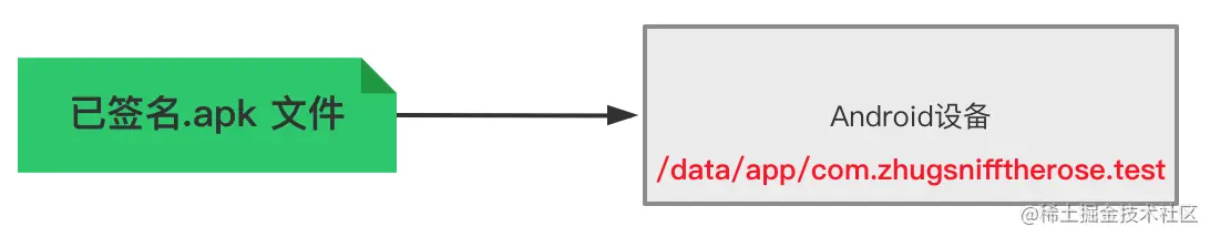 adb命令将.apk文件传输到Android设备的文件系统中。位置是由应用的包名定义的。例如,如果包是com.zhugsnifftherose.test,那么.apk文件将被放置在/data/app/com.zhugsnifftherose.test。