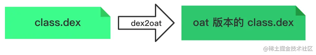 class.dex 文件从 .apk 文件解析后会存在特定目录,但Android并不是简单地放置一个classes.dex文件的副本,此时ART 会使用设备自带的 dex2oat,将classes.dex中的Dalvik字节码转换成本地机器代码。