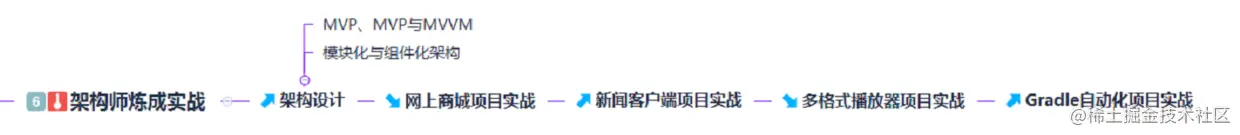在学好以上知识后就应该运用到实战当中了,在常见的实战当中:架构设计,网上商城项目实战,新闻客户端项目实战,多格式播放器项目实战,Gradle自动化项目 都是属于重中之重的。
