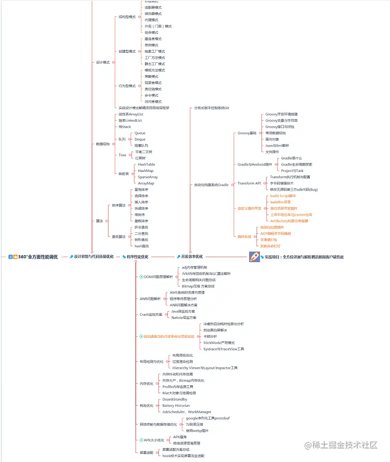 3. 360°全方面性能调优 Android性能调优方面包括了很多知识点,其中关键的就有设计思想与代码质量优化, 程序性能优化,和开发效率优化, 我们开发者将这些统称为Android360°全方面性能调优。 其实在软件开发过程中,想必很多读者都遇到过系统性能问题。而解决系统性能问题的几个主要步骤是: