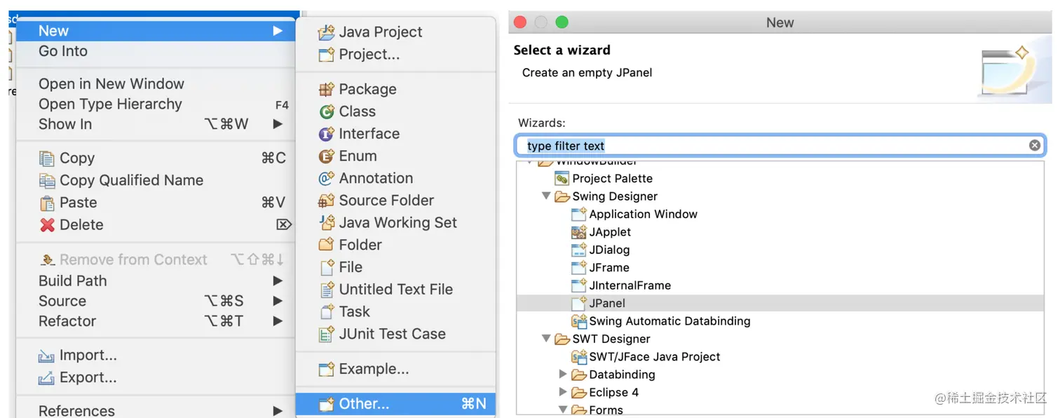 回到Eclipse,您可以从这里下载它。 我目前有Oxygen.3a版本,该版本有些旧,但是对于我们要做的并不重要。只需创建一个新项目,然后右键单击New,Other,然后选择JPanel: