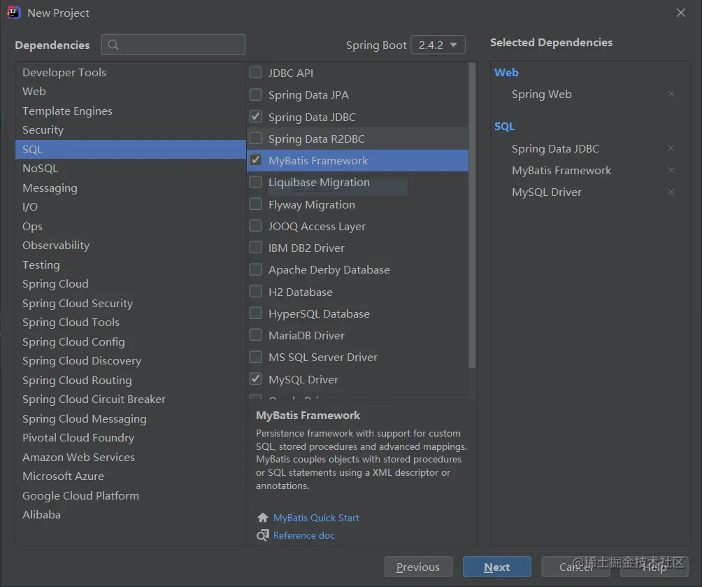 勾选依赖,web,JDBC,MyBatis,MySQL